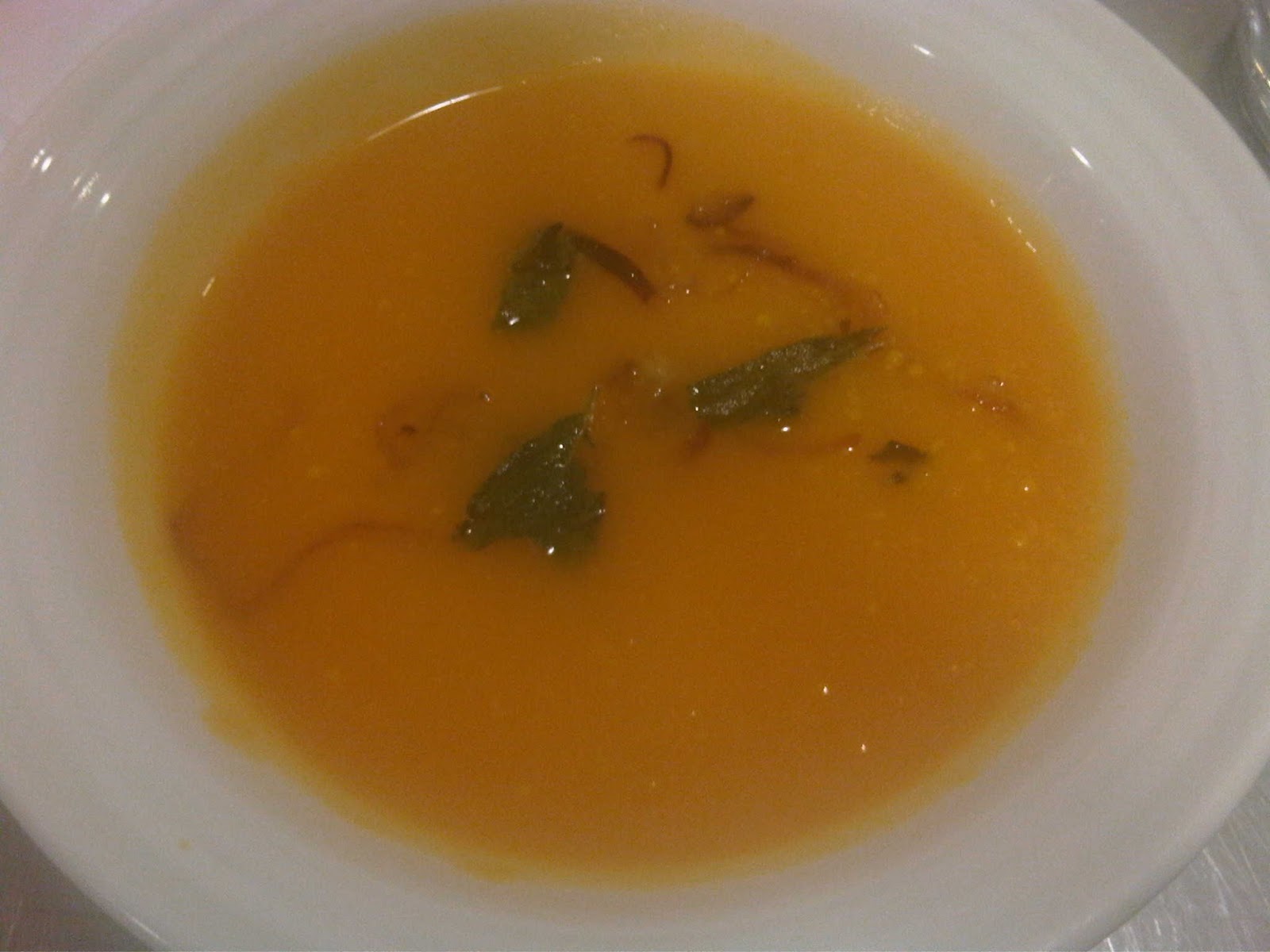 Butternut Squash Soup with Crispy Shallots and Sage/ Baby Greens Salad with Roasted Red Pepper Vinaigrette and Warm Walnut-Crusted Goad Cheese Medallions