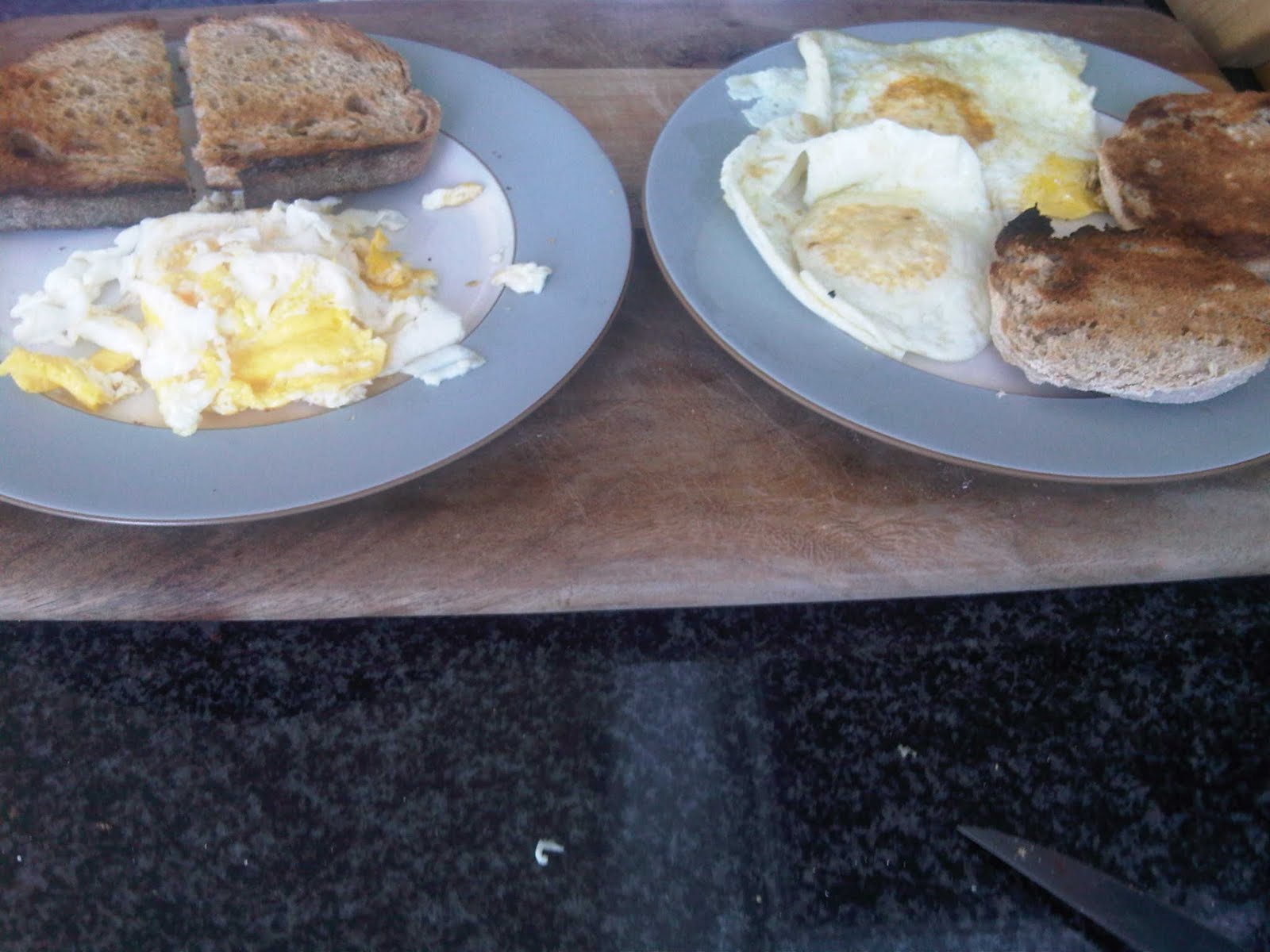 Much to my dismay, I cannot seem to cook eggs right. My boyfriend likes his eggs over easy and I’ve been working all summer to perfect my technique. My first attempt this morning is on the left — a bit of a mess so I ate those. Note: Don’t be afraid to make mistakes in the kitchen! My second attempt is pictured on the right. Much better! I ate mine with a slice of yeast free, whole wheat sourdough from Bread Alone and my boyfriend enjoyed his with a multigrain and flax seed english muffin. Of course, being British he also coated his eggs in ketchup (not recommended) π