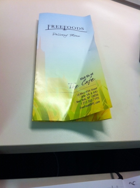 I stumbled on Free Foods by accident when looking for a juice bar nearby a Midtown meeting this spring. I was delighted to find one on 45th Street between 5th and 6th Avenues. Closer investigation revealed their food and juices were organic. I ventured to the restaurant – my expectations admittedly low – and found a delightful, bustling space with a variety of healthy lunch options – vegan, gluten-free, raw (all labeled accordingly) — and even fish and free-range egg and chicken options for the non-veggies among us. Fresh juices and smoothies in addition to typical lunch fare like soups, salads and sandwiches grace the menu. There is even a special Market Table of a la carte options. Some of today’s specials were: