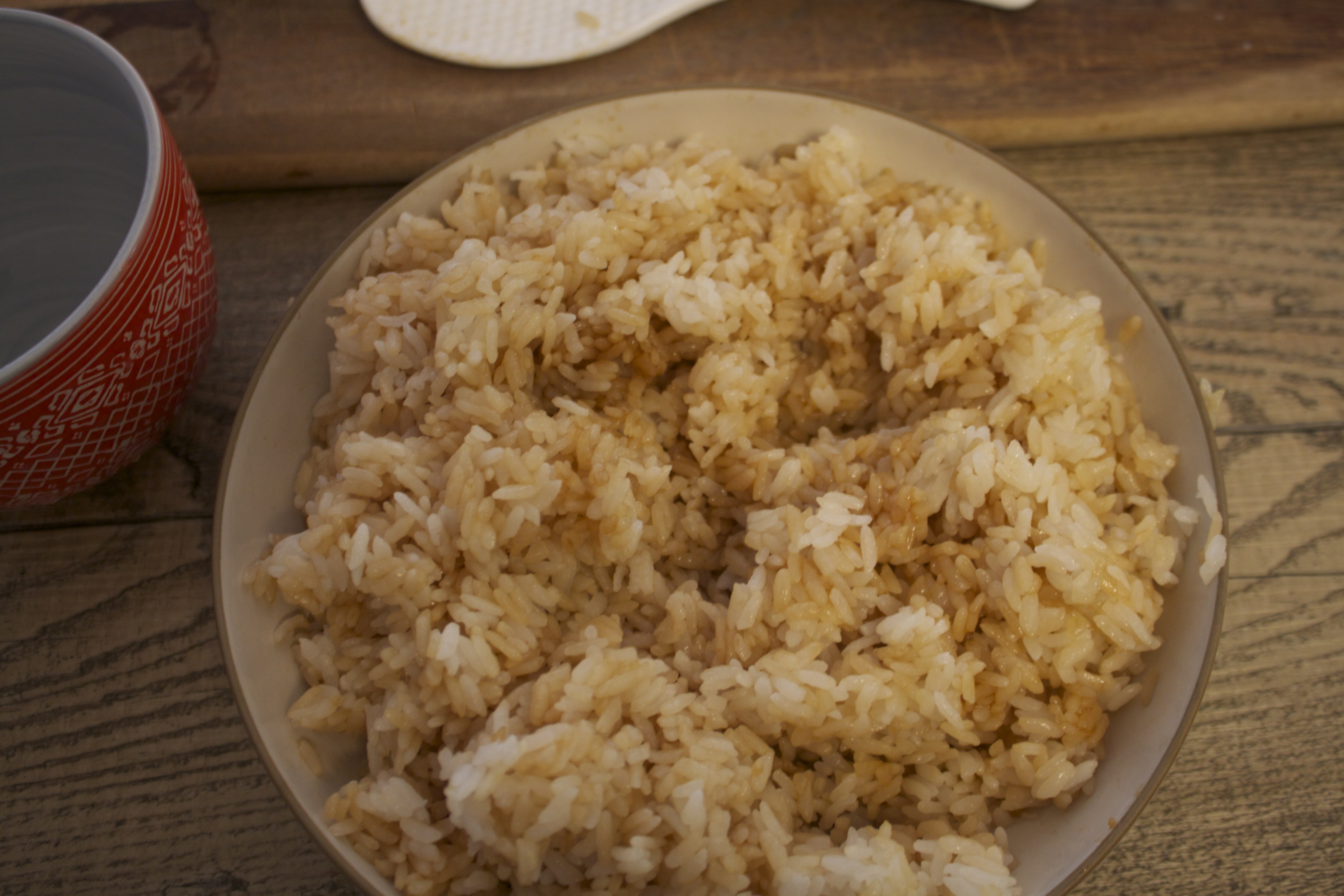 3. Transfer the slightly cooled sushi rice to a large bowl. Using a rice paddle and a small paper fan, fan the sushi rice as you slowly drizzle the sushi-su over the rice. Cut the rice with the rice paddle as you fan the rice to cool at the same time. Do not mix the rice, just cut through it until all the vinegar is absorbed.