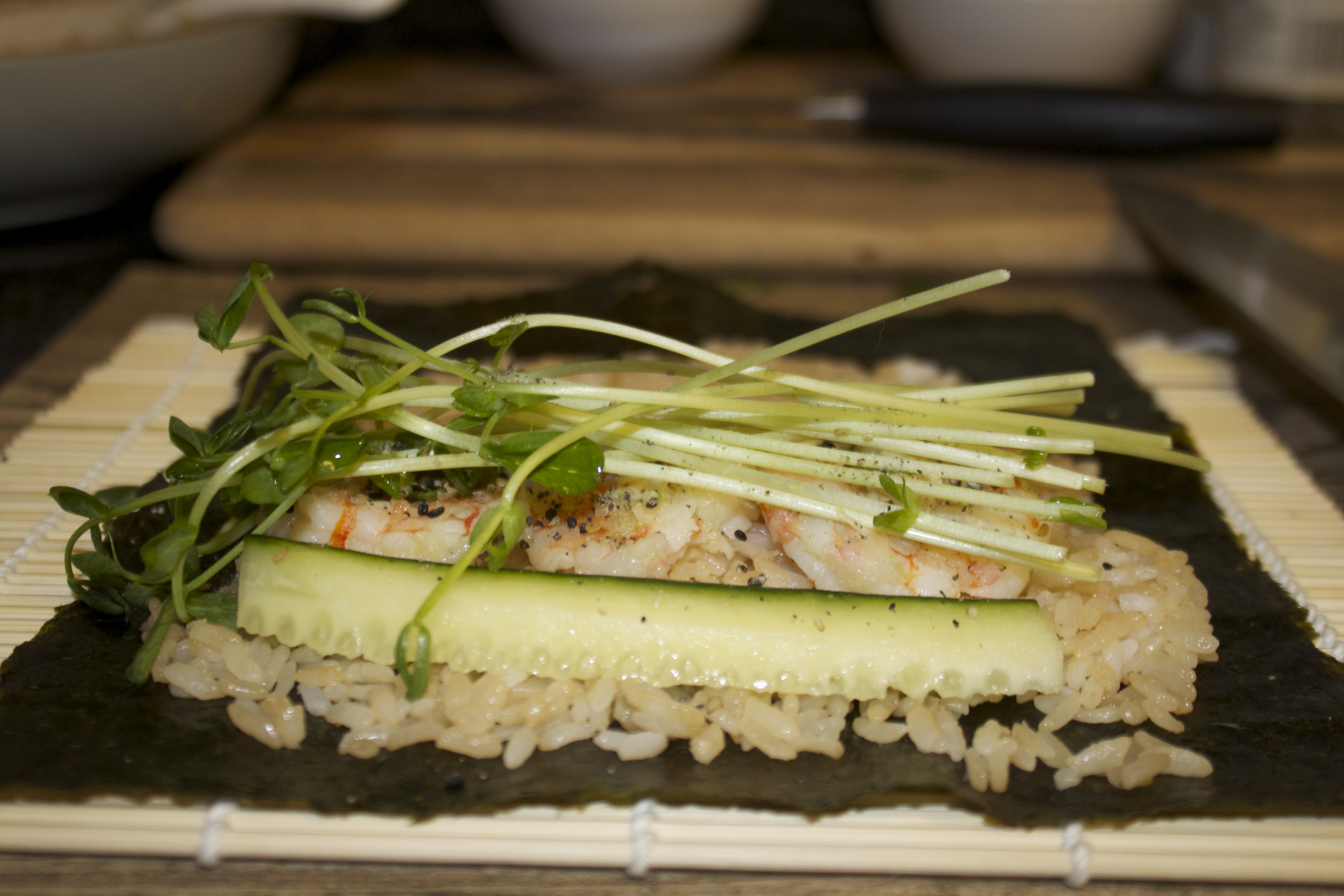 3. Using the rice paddle, spread a layer of approximately 1/2 cup rice in the middle of the nori sheet. At the bottom of the sushi roll, closest to you, add fillers, proteins and seasonings in a horizontal line. Tightly roll from the bottom up into a long maki roll. Gently squeeze the bamboo mat to tighten the roll.