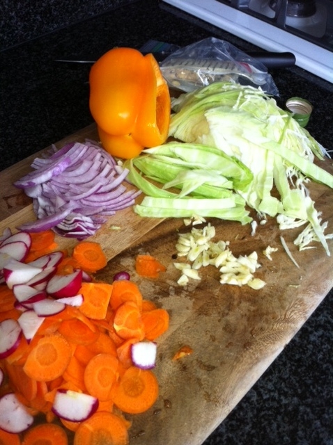 When they start to brown, add vegetables one kind at a time. Carrots and radishes take longer to cook so add those first. Cook until they are shiny and begin to soften then add the softer vegetables. When all vegetables are beginning to soften and fully coated with oil, add the tamari and continue to stir well. Be careful not to overcook. Season with a touch of sea salt and crushed red pepper or ground ginger.