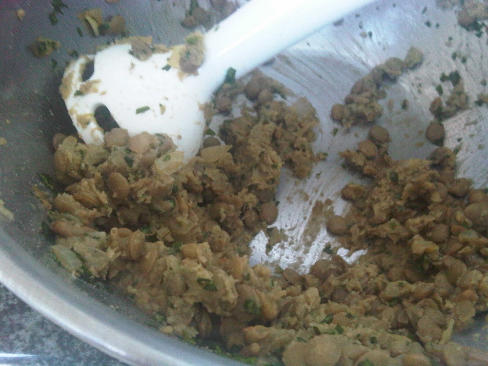 8. Remove from freezer and add all other ingredients and mix well. Use a hand mixer or blender to combine into a chunky paste (Note: not all ingredients need to be combined until smooth, there should be whole lentils still visible.
