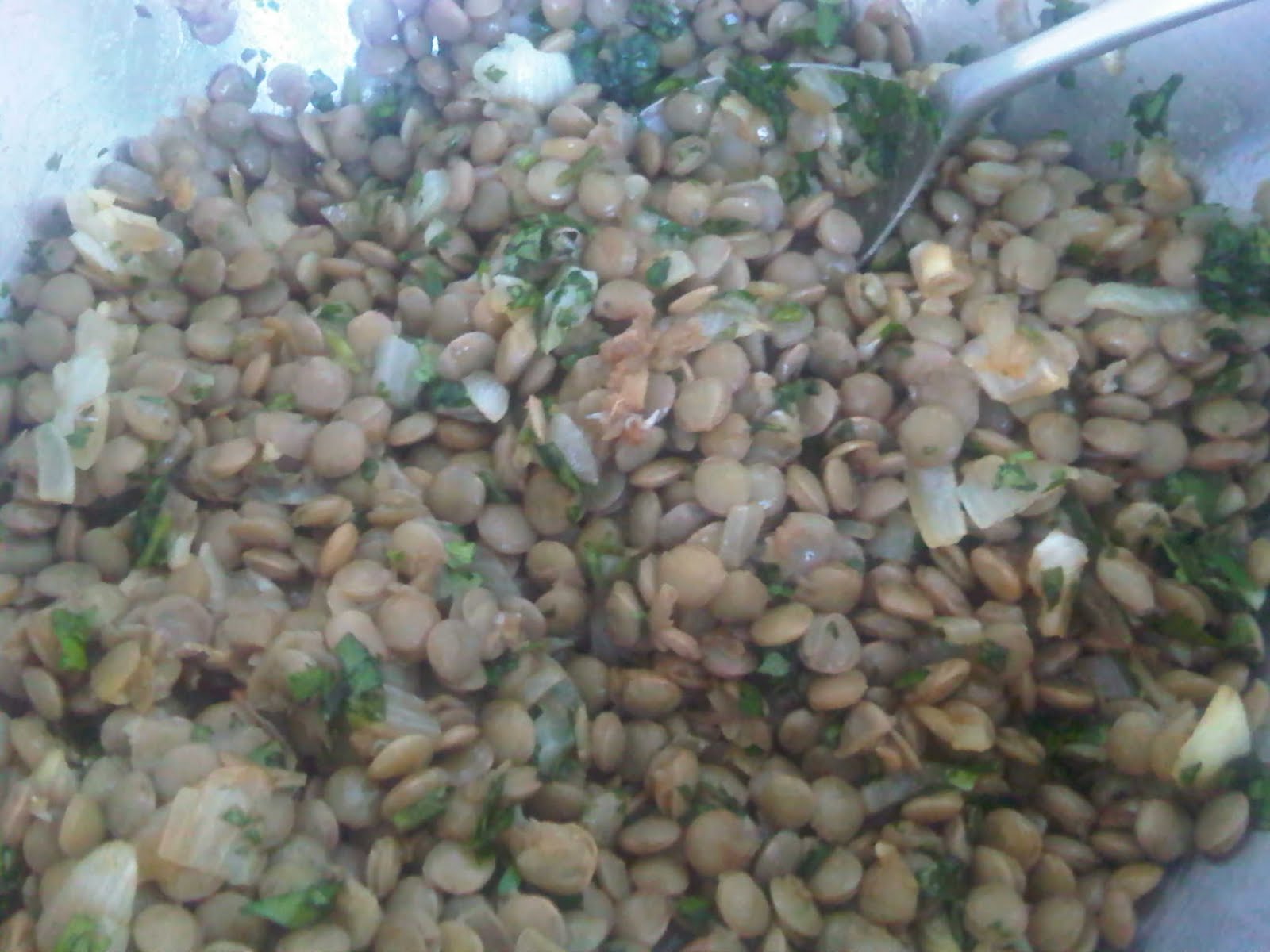 3. While lentils are cooking, sautΓ© onion and garlic in olive oil for 10 minutes.
