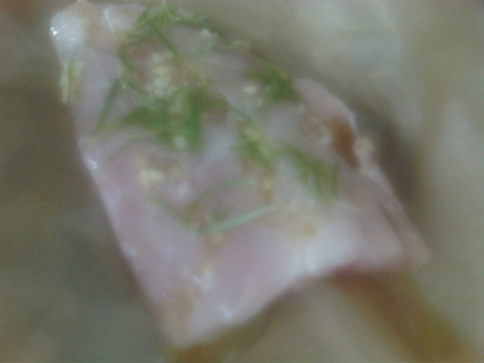 While the rice was cooking, I got started on the fish. I preheated the oven to 400 then diced up two cloves of garlic and mixed them with 1/2 tsp each of sea salt and pepper and 3 tbsps of olive oil.