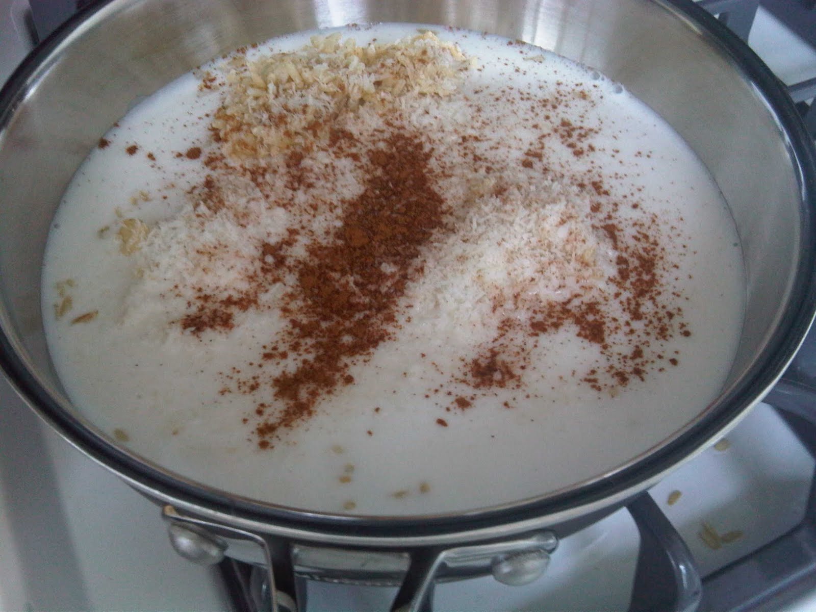 I dumped my two cups of leftover rice into a pot, added a can of light coconut milk, a half cup of almond milk, three Tbsps of unsweetened shredded coconut, 1/3 cup of all-natural, organic maple syrup (I used a little less so it wouldn’t be too sweet) and 1/2 tsp cinnamon. And cooked it all over medium heat for seven to 10 minutes.