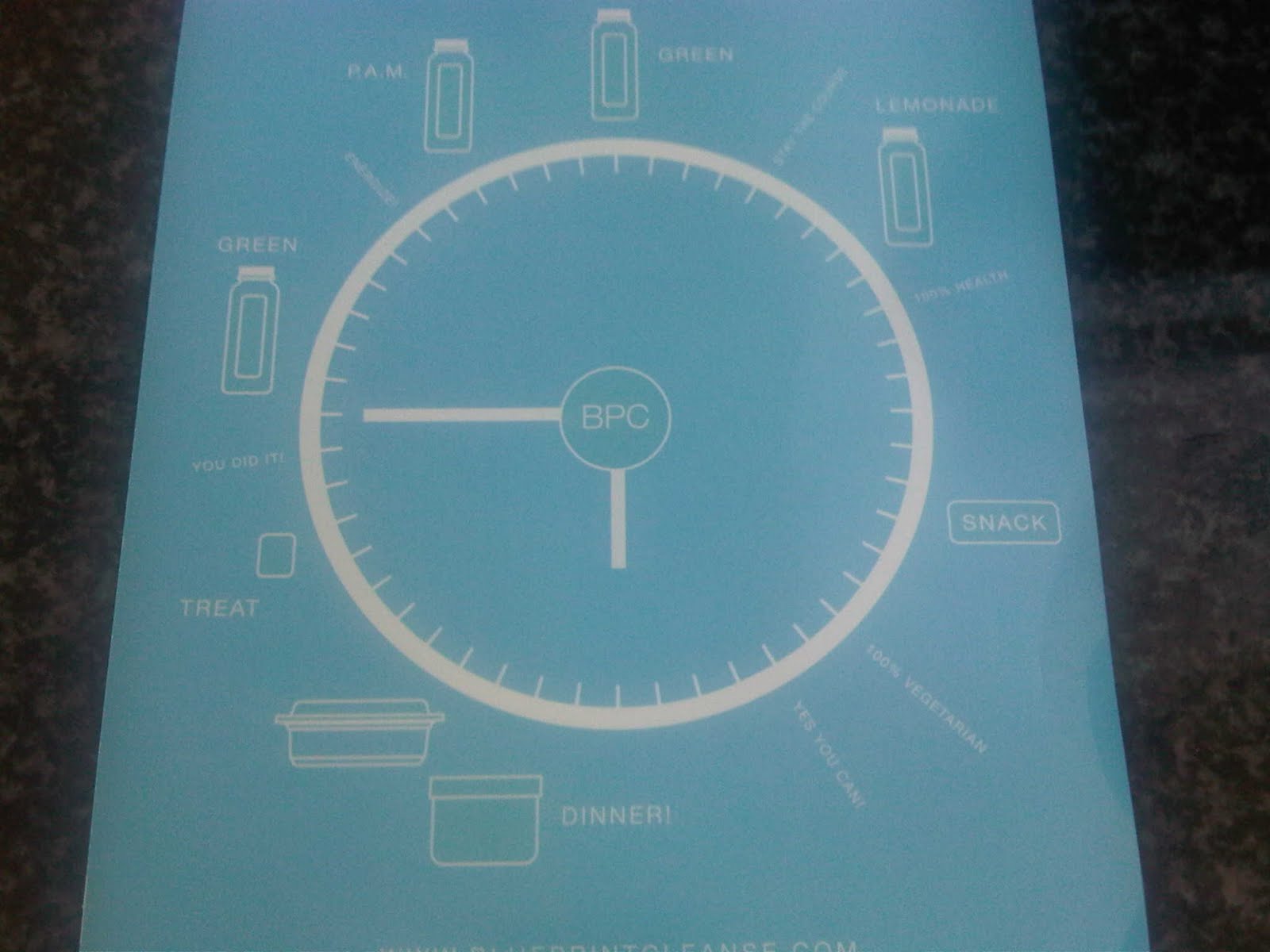 Following a six mile run this morning, as I was packing my juice and food into the handy carry-all provided by the nice people at BPC, I noticed a different instruction card that made the timing of the juices seem more clear to me than the card I had received with my first three days of supplies.
