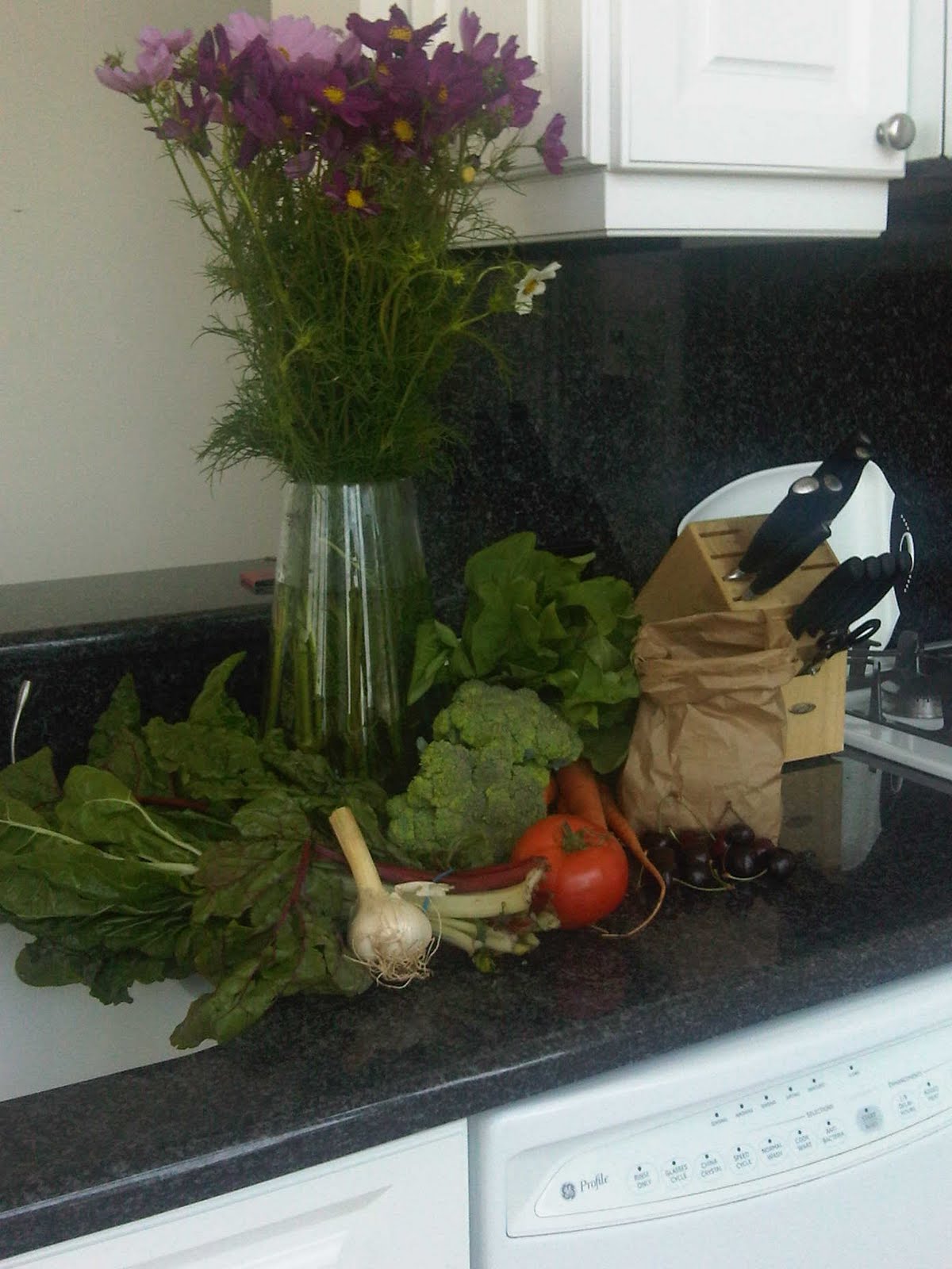 Summer is here and that means outdoor Farmer’s Market and the 2010 World Cup! My weekend was jam-packed with both. David returned from a week-long business trip to South America early Saturday morning so after breakfast, we headed over to the Tribeca GreenMarket. Few things make me happier than strolling fruit and vegetable stands for local, seasonal fare. We picked up some fresh garlic, cherries, arugula, Swiss chard, carrots, broccoli, a tomato and some fresh flowers followed by a disappointing USA loss to Ghana viewed on the big screens at Reade Street Pub and Kitchen 🙁