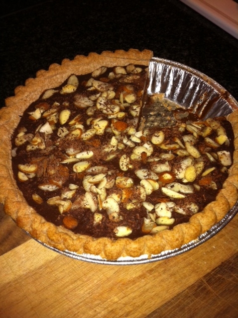 I poured this mixture into the golden-baked pie crust and sprinkled slivered almonds on top and shavings from a 100% dark chocolate Girardhelli chocolate bar for added antioxidants.